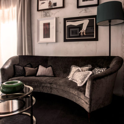 On the upper level, there is a large loft with a sleeping area, a sitting area/bar with a Nespresso coffee/tea machine, and an elegant dressing table.