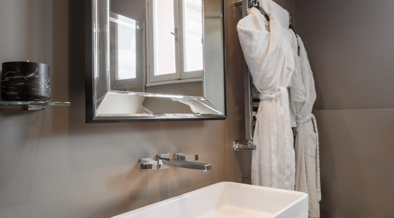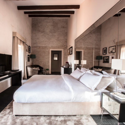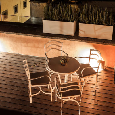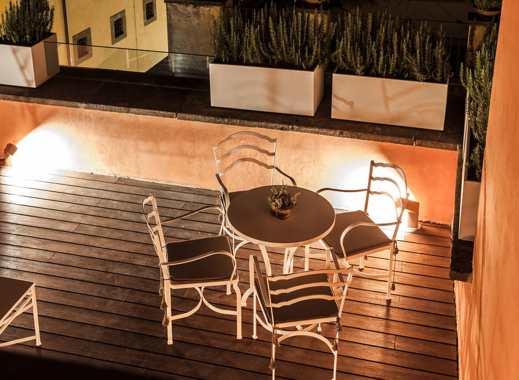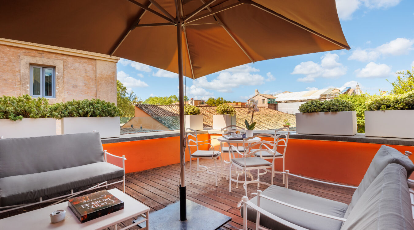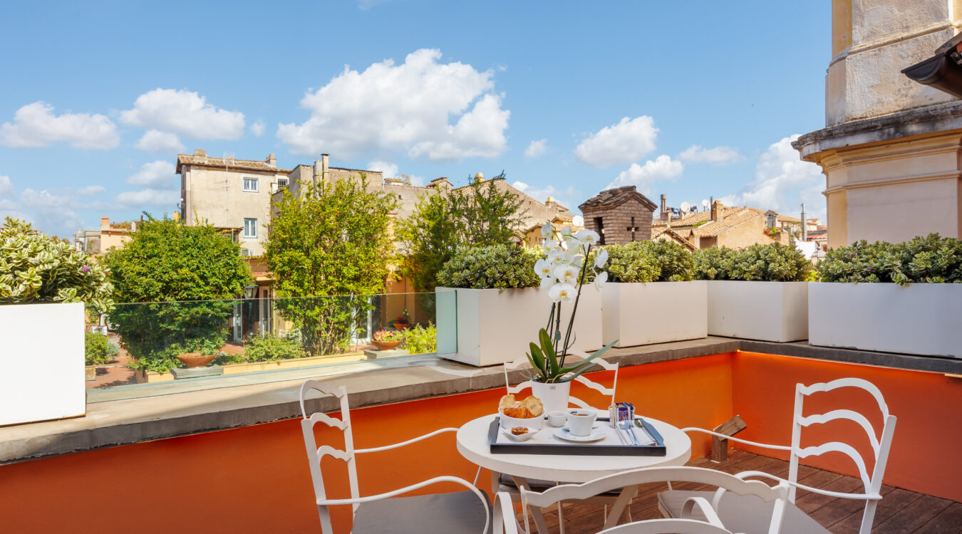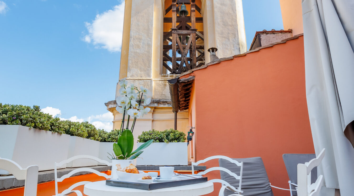 The D.O.M Suite is an exclusive 50m2 apartment encompassing two floors. The bathroom and wardrobe is located on the lower floor, along with a private terrace (25 sq mt) offering views of the rooftops of the Regola neighborhood and antique wooden bell tower of the church of Santa Lucia del Gonfalone.