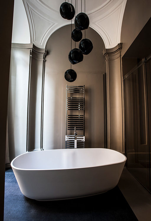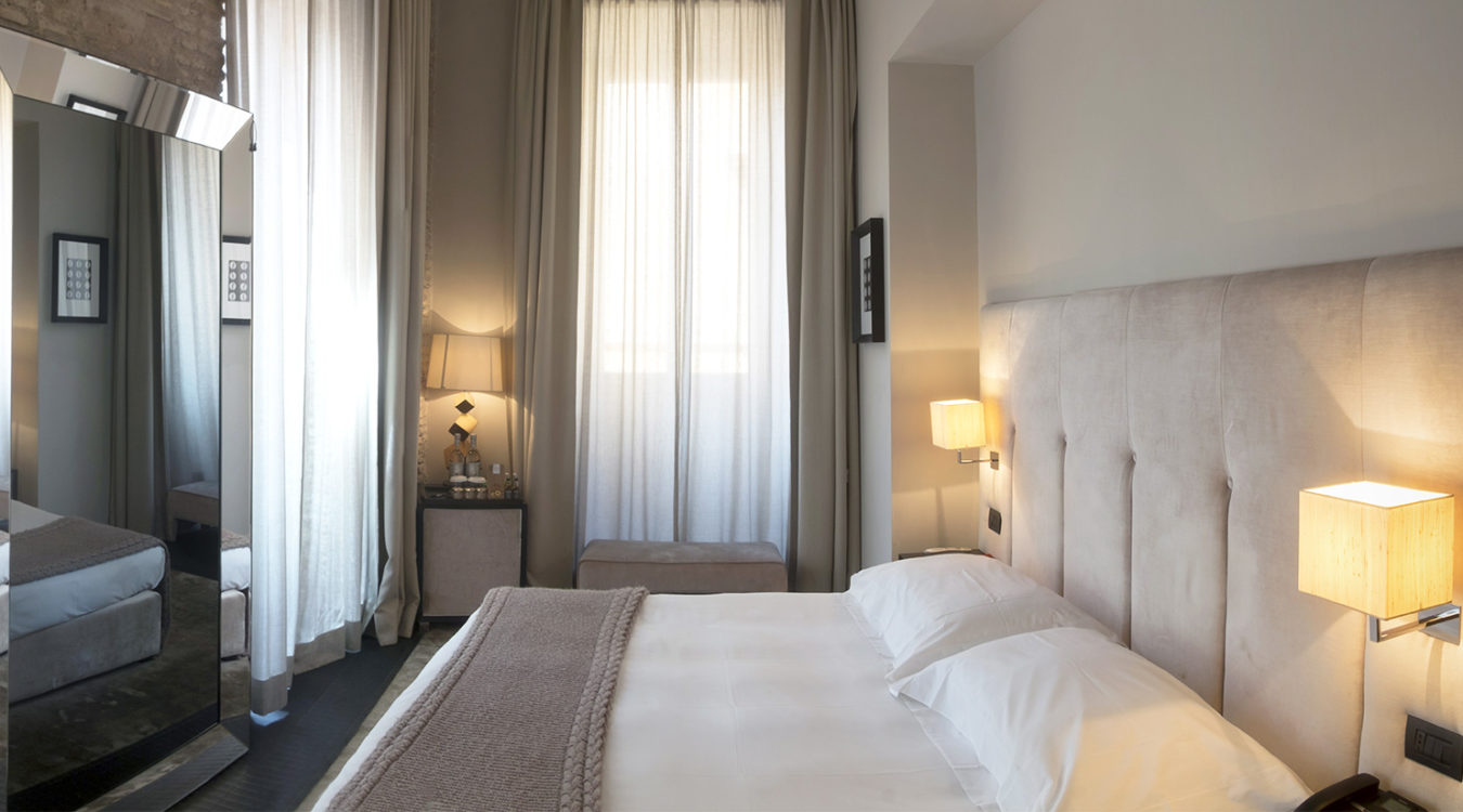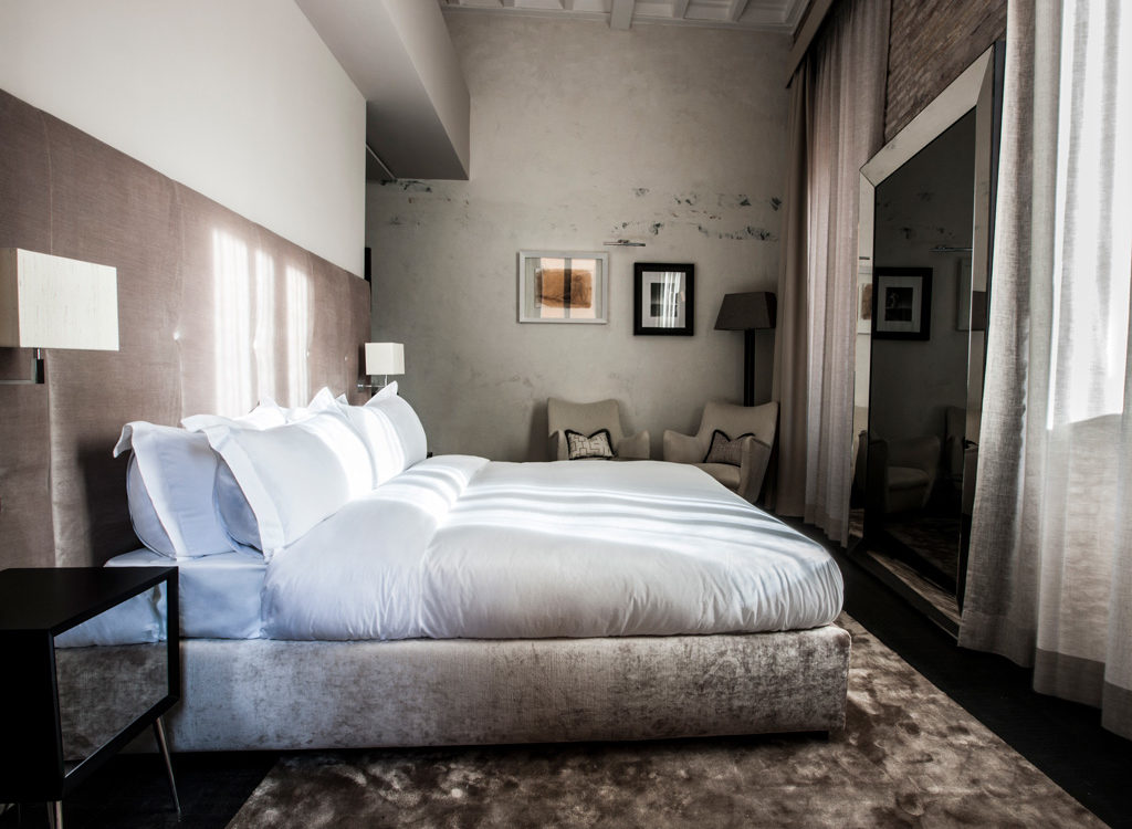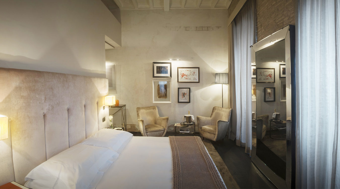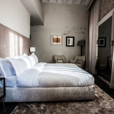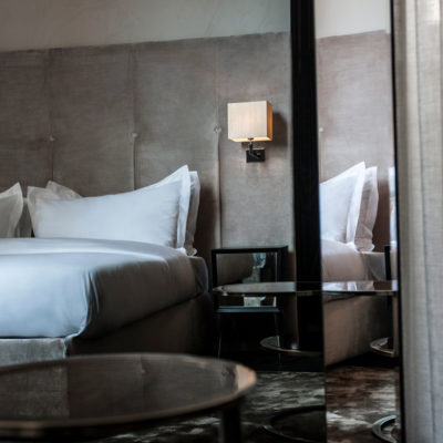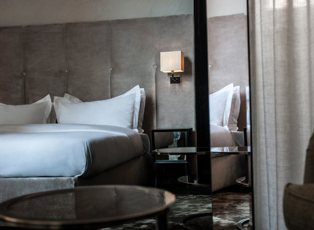 Junior Suites (38 m2) feature large king size beds with velvet headboards and cashmere and silk carpeting directly embedded in the handcrafted black oak flooring. These suites feature an intimate separate living area complete with vintage upholstered furnishings and double sunlight exposure thanks to four large windows and the suite’s corner positioning.