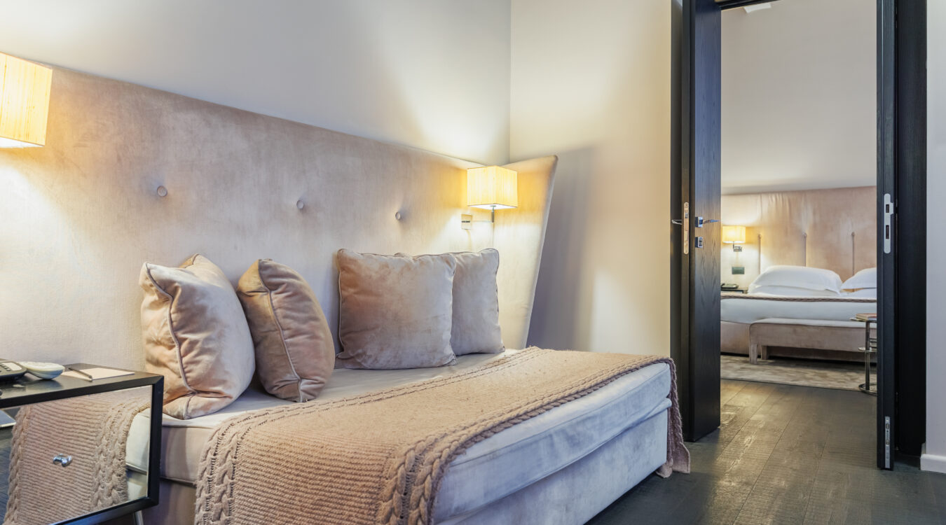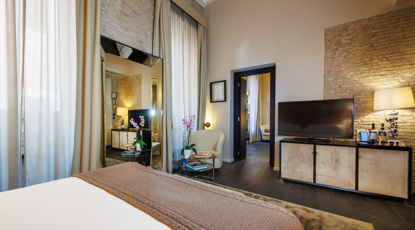 The large separate living area, which connects to the master bedroom, can be converted into a second bedroom with a queen bed. Four large windows adorn the room allowing for generous light and views overlooking Via Giulia.