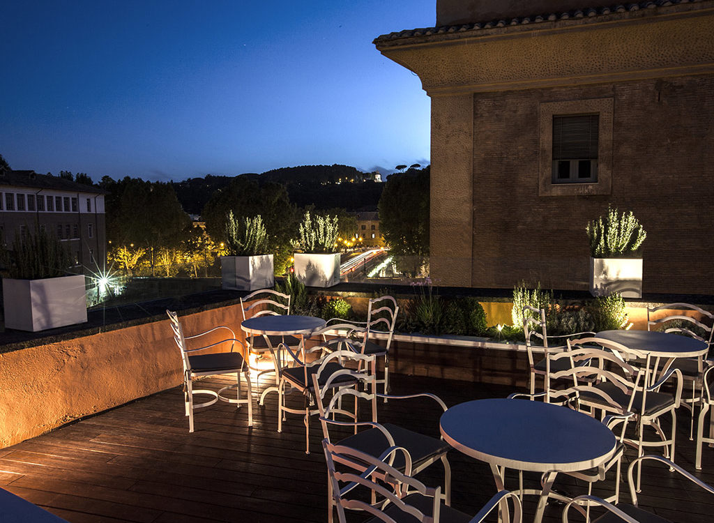 La posizione è unica: completamente immersa – quasi protetta – tra i tetti e i campanili del centro storico, si affaccia sul Lungotevere e sulla verde collina del Gianicolo.